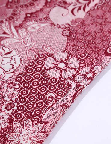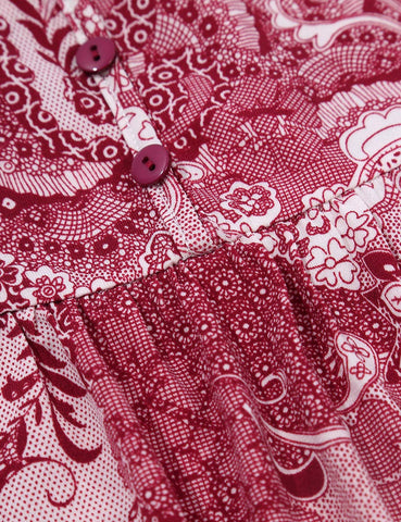 BAISHENGGT Women's Deep Red Print V Neck Buttons Pleated Flared Comfy Tunic Tops
